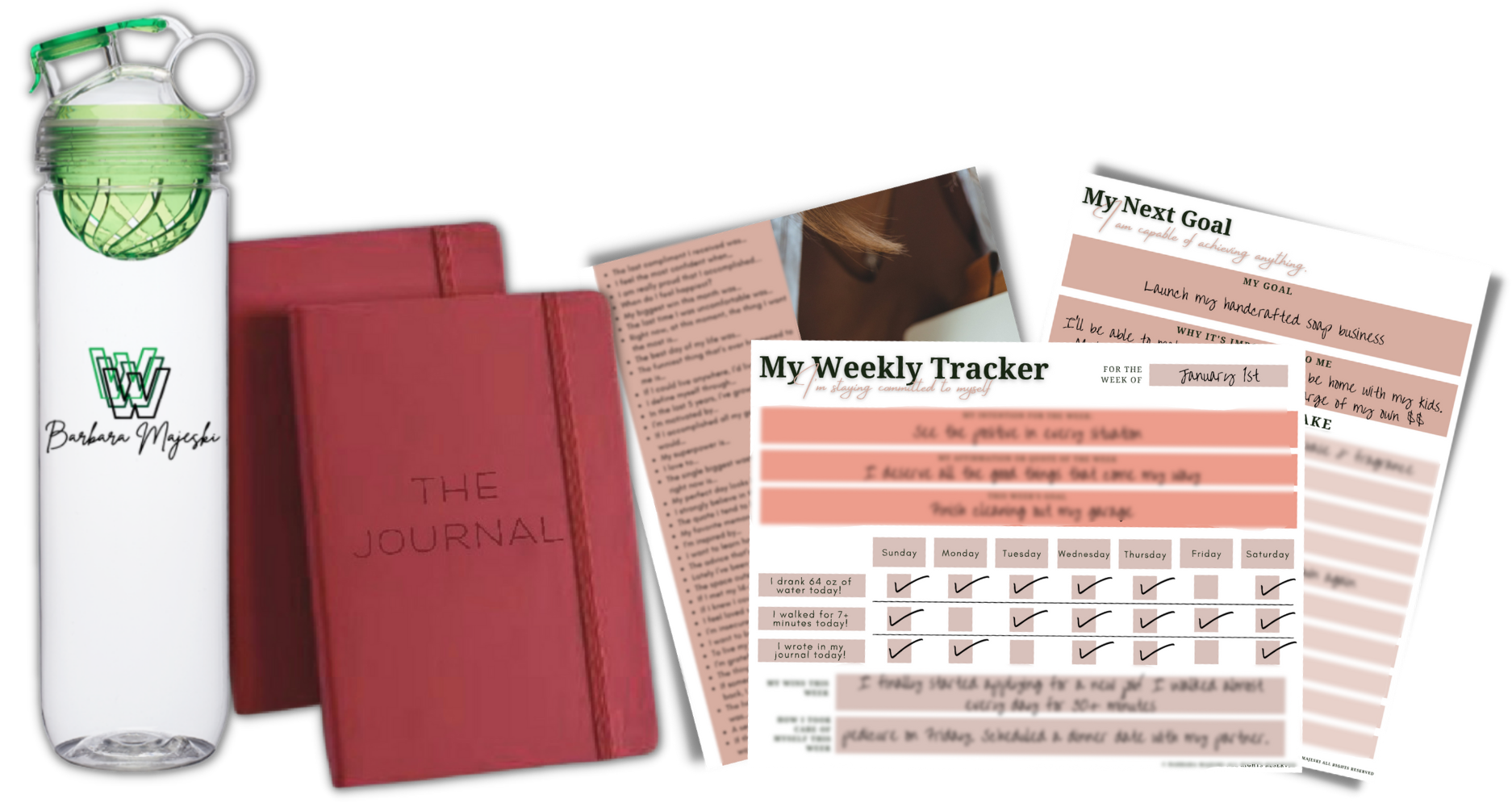 ONE TIME OFFER: Reset Bundle - A beautifully crafted leather-bound journal designed to help YOU create the consistency you want in your life, a 32oz water bottle with fruit infuser - simply fill it twice a day and you’ll hit your 64 ounce goal with no problem! PLUS Bonus Downloads to help you reach your goals!